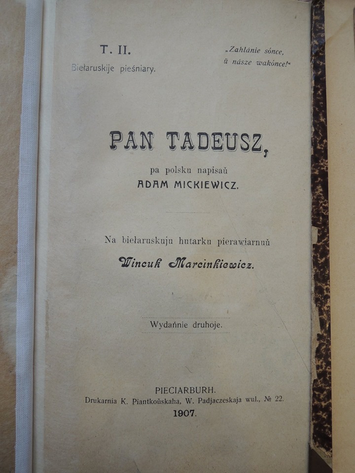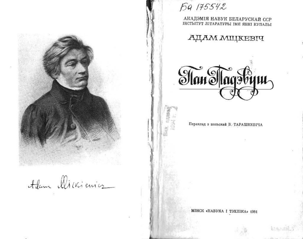 Выкананы ў 1931—1932 гг. у лёхах польскіх турмаў вядомым беларускім грамадскім і палітычным дзеячам Браніславам Тарашкевічам пераклад «Пана Тадэвуша» ў выніку паўторнага арышту ўжо ў СССР, апынуўся ў нетрах падвалаў НКУС[9] і пазней быў выдадзены асобным выданнем.