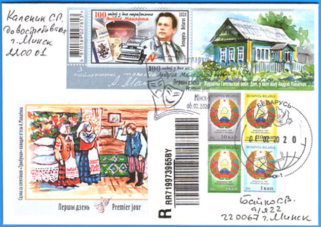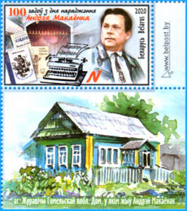 Беларускае грамадства, занятае больш пільнымі справамі, фактычна замаўчала 100-годдзе пісьменніка, адазваліся толькі некаторыя СМІ. Але вось Белпошта выпусціла марку і канверт першага дня. Дызайн маркі распрацавала Алена Мядзведзь. Мастак – Таццяна Дольская. У аддзяленні паштовай сувязі № 1 г. Менска (магазін “Філатэлія”) прайшло спецгашенне штемпелем “Першы дзень” з фіксаванай датай на канверце “Першы дзень”. Мастак канверта “Першы дзень” Т. Дольская, дызайн конверта і штэмпеля А. Мядзведзь.