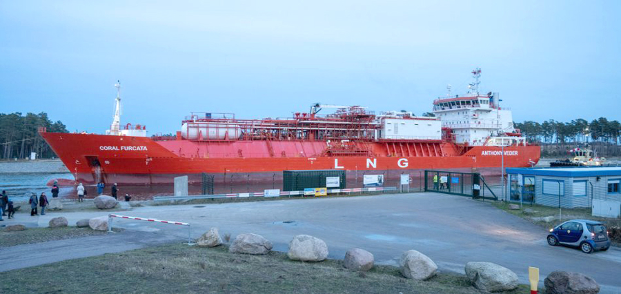 Федэральны канцлер Олаф Шольц і міністр эканомікі Роберт Хабек урачыста адкрылі другі тэрмінал для звадкаванага прыроднага газу ў Любміне.