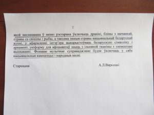 На днях прыляцеў ліст з Лідскага райвыканкама, паведамілі, што рэкамендуюць уласніку рэстарана афармляць інтэр’ер з выкарыстаннем беларускіх прыказак і выслоўяў, а яшчэ ўнiформу для афiцыянтаў пашыюць з iльняной тканiны з элементамi вышыванкi. Фонавае музычнае суправаджэнне будзе ўключаць у сябе нацыянальныя кампазiцыi i народныя песнi.