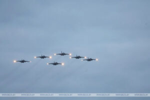 У сувязі з тым, што Прэзідэнт Беларусі днём 9-га траўня прымаў удзел ва ўрачыстасцях у Маскве, парад у Менску праходзіў вечарам. І гэта была вельмі прыгожая і велічная дзея. Па зразумелых прычынах паветраная частка параду была намнога больш прадстаўнічай, чым у Маскве. У астатнім Менск ніколькі не ўступіў Маскве, а плац-парад быў, як заўсёды, унікальным.