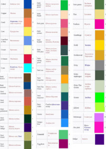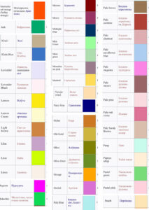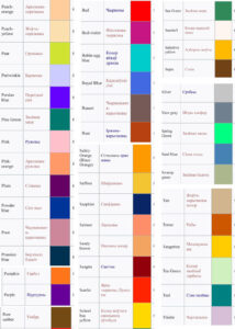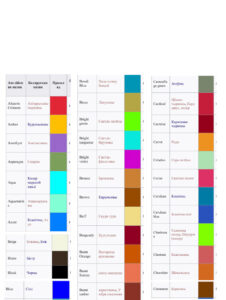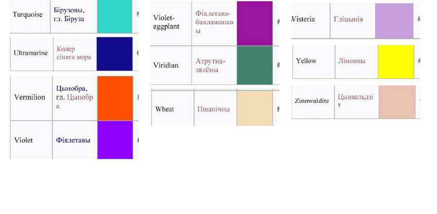 Маецца і больш поўны спіс беларускіх колераў, тут, праўда, будуць паўтарэнні ўжо прыведзеных у кароткім спісе, але ў другім спісе ёсць ангельская версія: