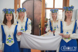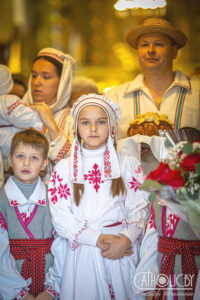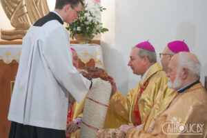 Перад пачаткам святой Імшы, якую ўзначаліў біскуп Пінскі Антоній Дзям’янка, парафіяне, апранутыя ў нацыянальнае адзенне, прывіталі галоўнага цэлебранта і прысутных іерархаў, да якіх яны падышлі, каб пачаставаць караваем, які трымалі ў руках.