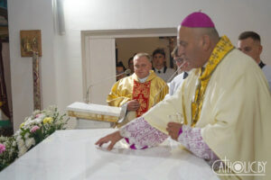 Біскуп Антоній Дзям’янка намасціў алтарную менсу, пасля чаго паставіў на алтар начынне з кадзілам, дым якога сімвалічна азначае ахвяры і малітвы вернікаў, што з гэтага святога месца будуць узносіцца да Бога.