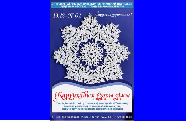 У Аддзел рамёстваў і традыцыйнай культуры дзяржаўнай установы “Лідскі раённы цэнтр культуры і народнай творчасці” гасцінна адчыніла дзверы выстаўка дэкаратыўна-прыкладнога мастацтва “Карункавыя ўзоры зімы”.